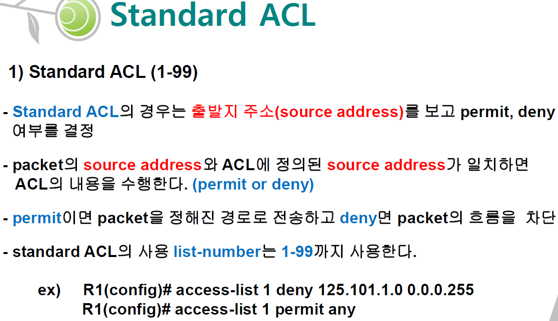 standarACL은 source주소를 보고 permit/deny를 판단합니다.