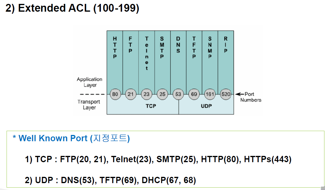 - Extended Access list -> source address 외에도 destination address, protocol, port 번호 등 좀더 자세한 정보를 참조해서 Filtering 여부를 결정합니다.(4계층의 포트까지 봅니다.)