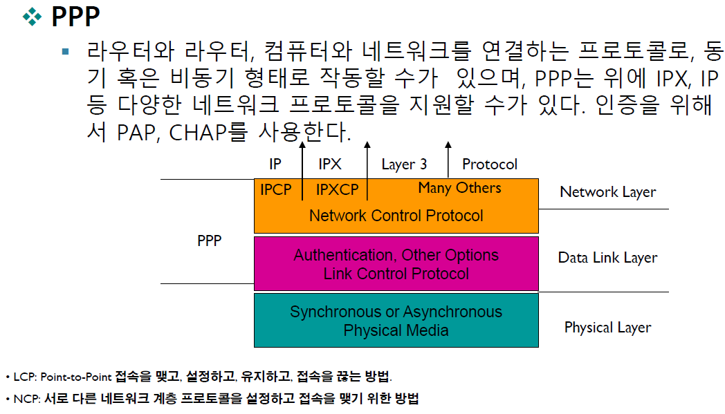• NCP(Network Control Protocol): 서로 다른 네트워크 계층 프로토콜을 설정하고 접속을 맺기 위한 방법