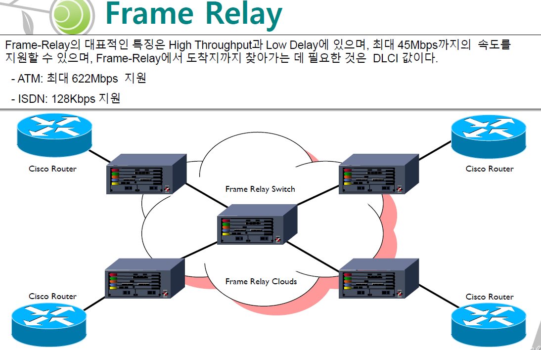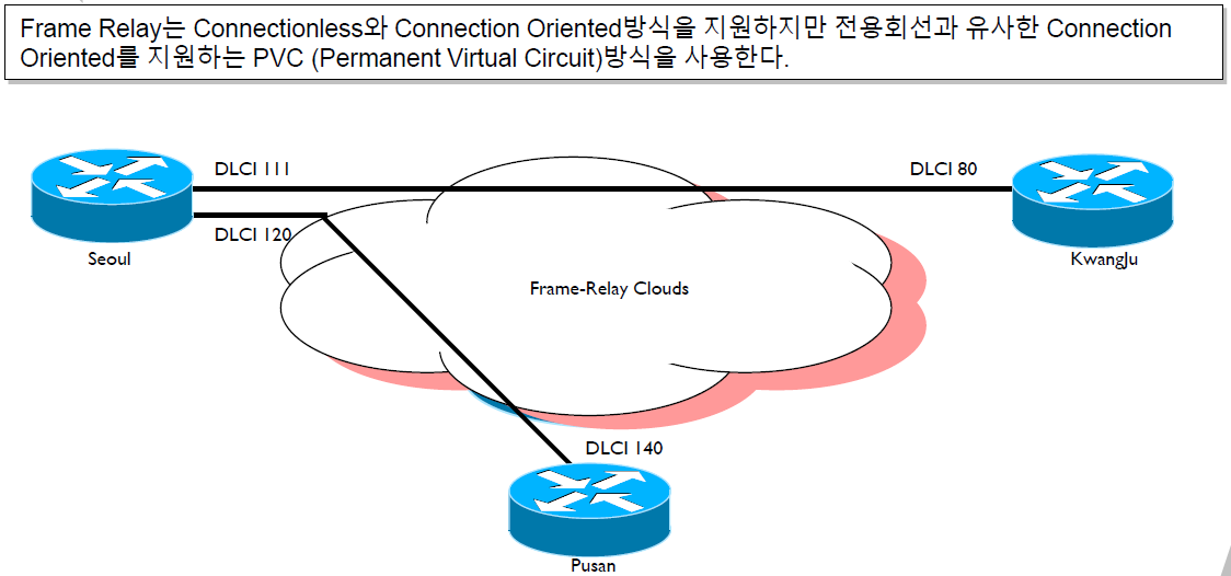 Connection Oriented 방식을 지원하는 PVC(Permanent Virtual Circuit)방식을 사용합니다.