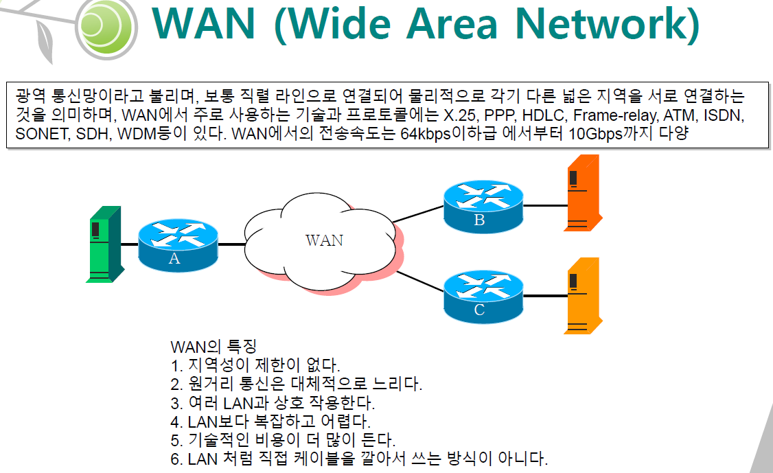 6. LAN 처럼 직접 케이블을 깔아서 쓰는 방식이 아니다.( 보통 나라에서 국가망을 위해 매설하고 설치합니다.)