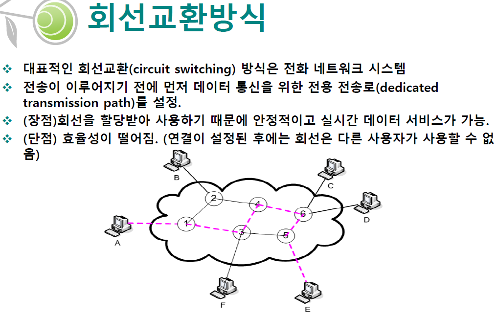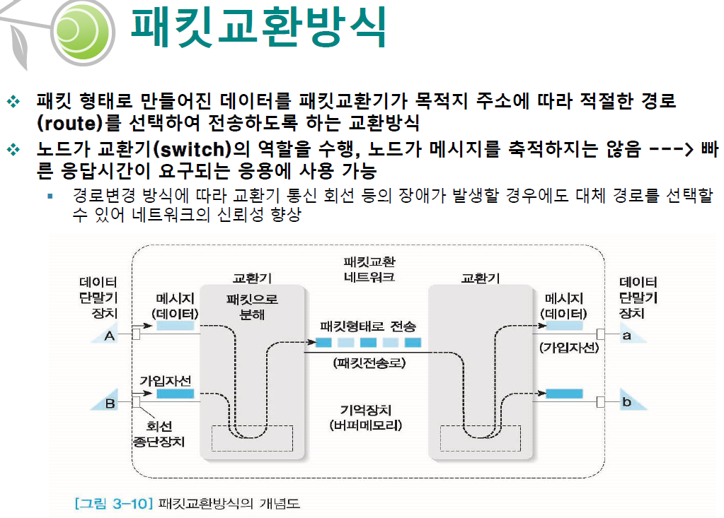 노드가 교환기(switch) 의 역할을 수행 , 노드가 메시지를 축적하지는 않음 ------> 빠른 응답시간이 요구되는 응용에 사용 가능