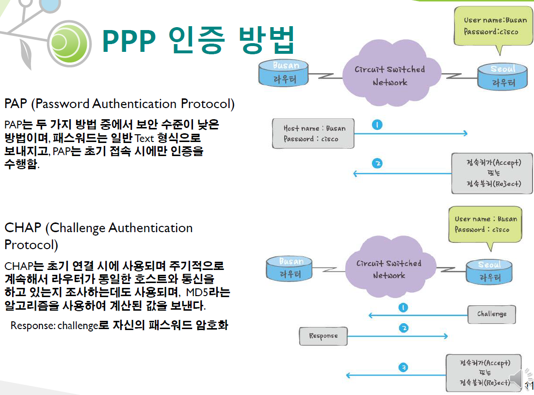 데이터의 크기와 압축, 인증에 대한 정보를 인식하게 된다. - 2. 설정이 완료가 되면, CHAP 또는 PAP가 연결을 인증하기 위해 사용될 수 있으며, 인증 절차는