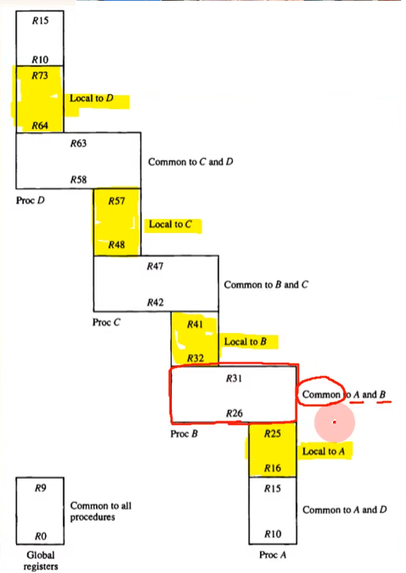 프로시져A는 레지스터 16~25번까지 쓸 수 있고 프로시져B는 레지스터 32~41까지 쓸 수 있다.