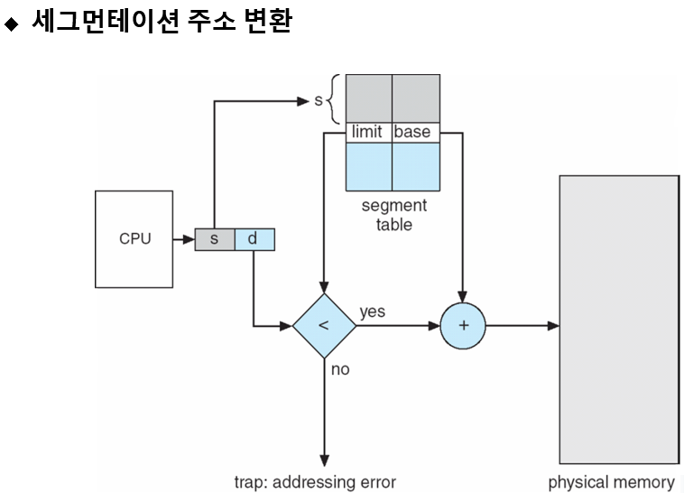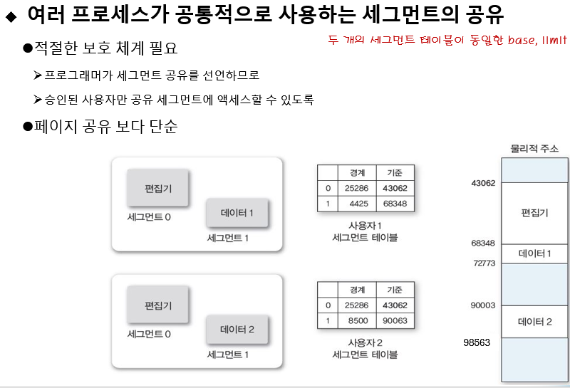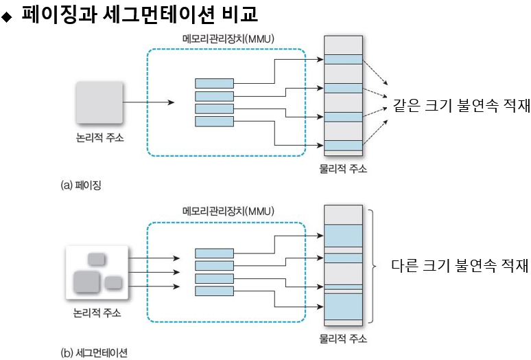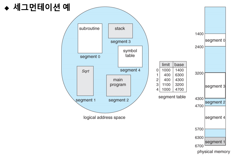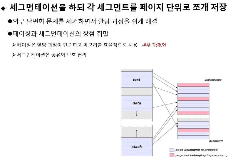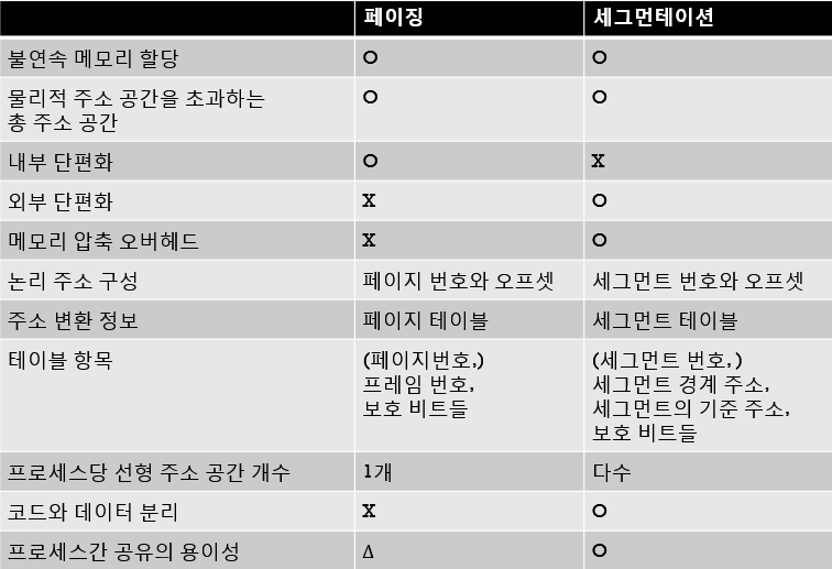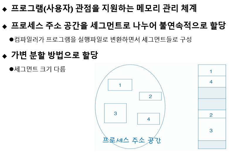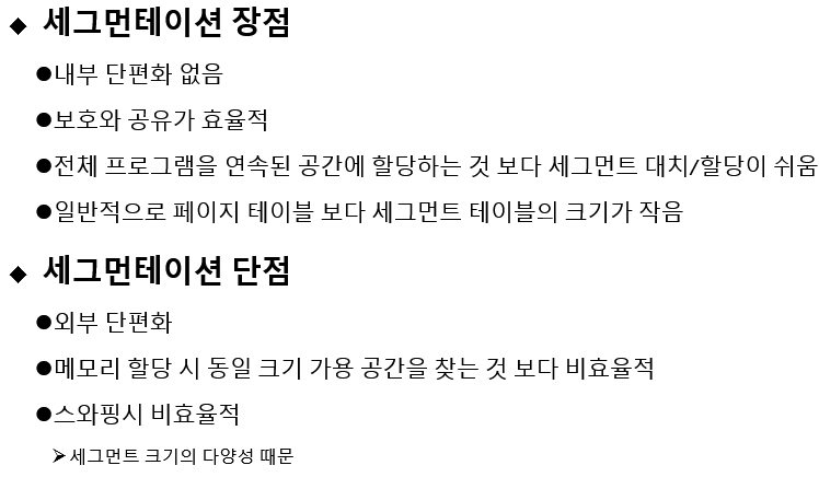 - -세그먼테이션은 동적 대치 알고리즘을 사용하므로 원할 때마다 메모리 압축 가능