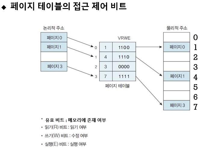 페이지 테이블의 접근제어 비트 - 권한 있는 프로세스만 페이지 읽기, 쓰기, 실행