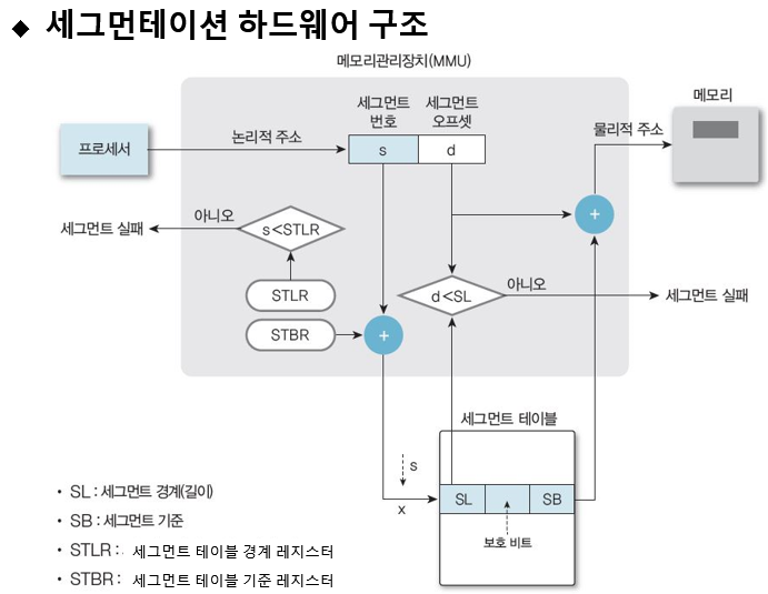 - 세그먼테이션에는 메모리 관리 장치(MMU)에 프레임 번호 + 크기 가 있습니다.