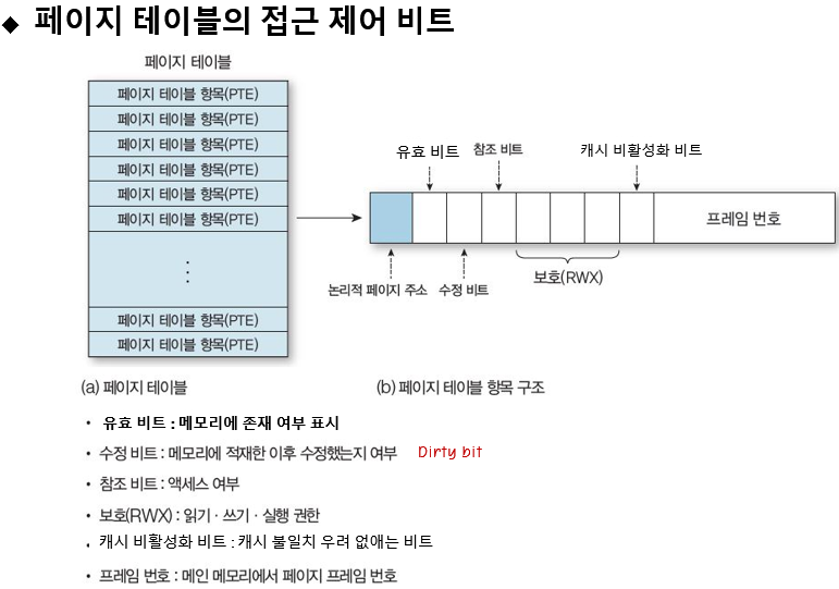 수정 비트 - 가상 메모리를 관리하려면 페이지가 수정이 되었는지, 한 번이라도 읽혔는지 확인하는 비트입니다.