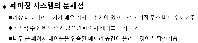 페이징은 큰 페이지 테이블을 메모리에 저장해야 하는 단점.
