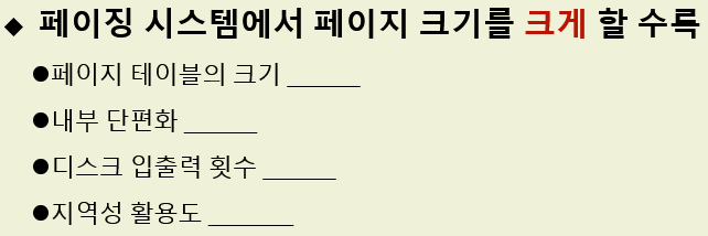 - 페이지 크기를 크게 할수록 페이지 개수가 작아집니다.( 페이지 테이블 크기 감소)