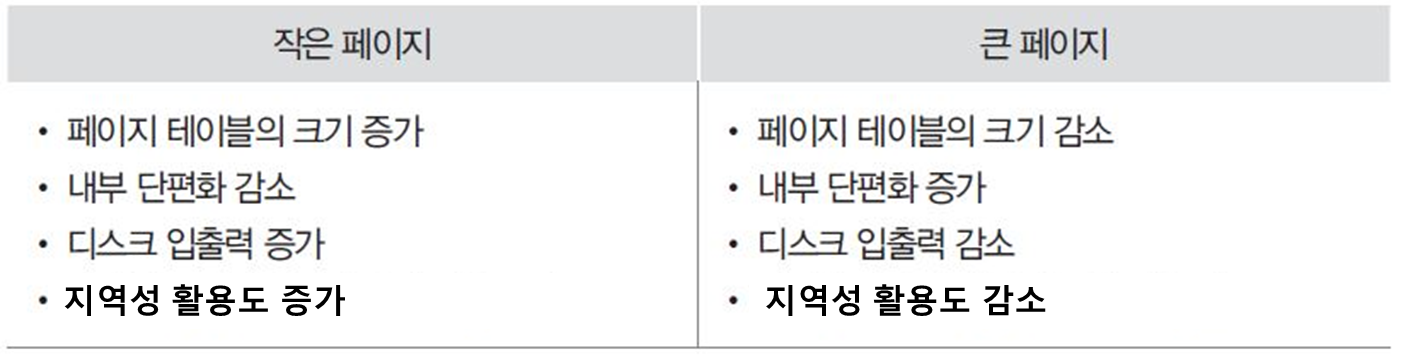- 페이지 크기는 메인 메모리의 크기와 프로그램 크기에 영향을 받음