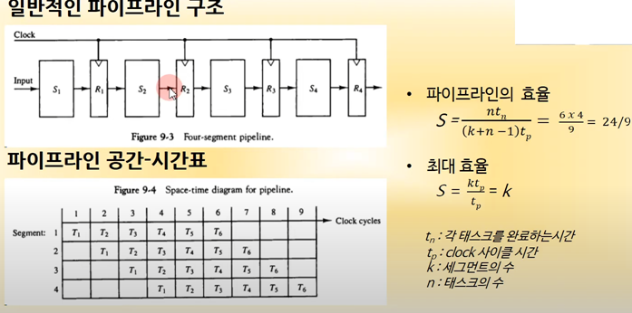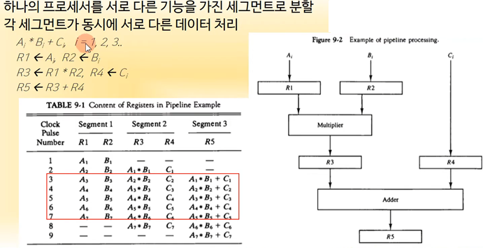 파이프라인을 쓰지않고 클럭 하나당 하나의 동작만 수행하면 21클럭이 걸린다 근데 파이프 라인으로 9개의 클럭으로만 데이터를 처리 할 수 있다.