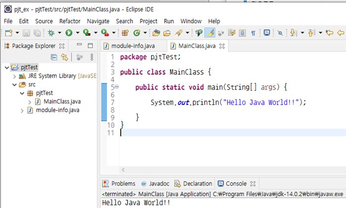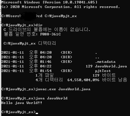 javaWorld.class파일이 나온다. 이를 java로 실행시키면 코드가 동작한다.