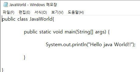 메모장에 위코드를 넣고 javaWorld.java를 만들고