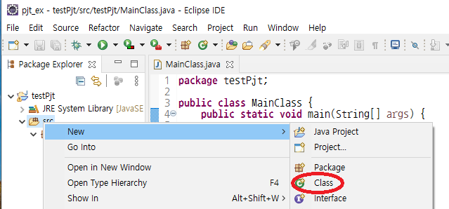 이클립스 왼쪽 프로젝트 만든 것 아래 src – 오른쪽클릭- new - class