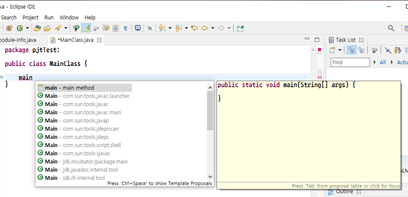 ctrl+스페이스바 를 동시에 누르면 어시스트 코드가 나온다.