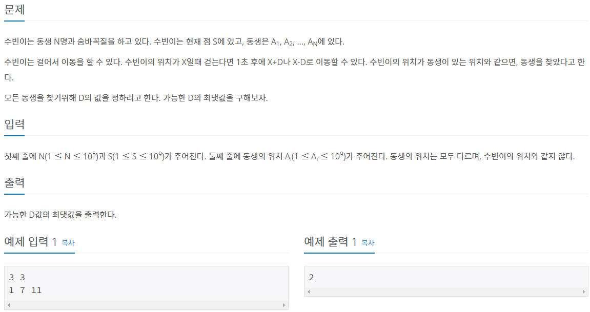 수빈이의 위치 S에서 각 동생의 위치의 절대값을 구하면 수빈이가 얼마나 이동해야하는지 알 수 있습니다.