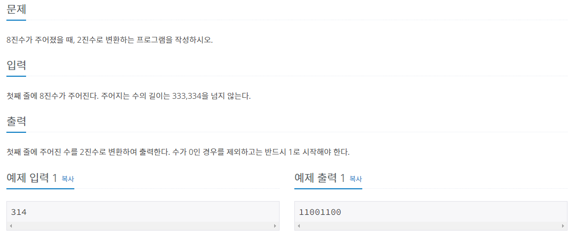 이번에는 내장함수를 이용해서 풀어봤습니다. 8진수로 입력을 받고 -> bin()으로 2진수를 만듭니다.