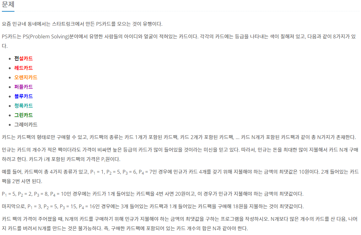 카드의 개수(N)를 구해야 합니다. 1부터 순서대로 카드팩안에 카드들이 있습니다. 동일한 개수인데 가장 많은 금액을 내야한다고 합니다.