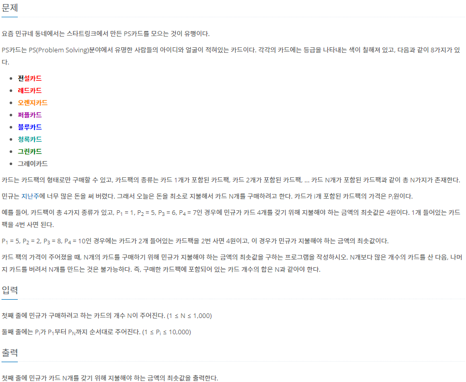 카드 4개를 사야할 때 (카드팩1) * 4, (카드팩2 + 카드팩2), (카드팩3 + 카드팩1), (카드팩4) 4개의 상황이 주어지는대 (카드팩1) * 4이 가장 작으니 골라줍니다.