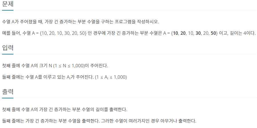가장 긴 증가하는 부분 수열과 비슷하빈다. 이번에는 가장 긴 증가하는 부분 수열을 찾아야합니다.