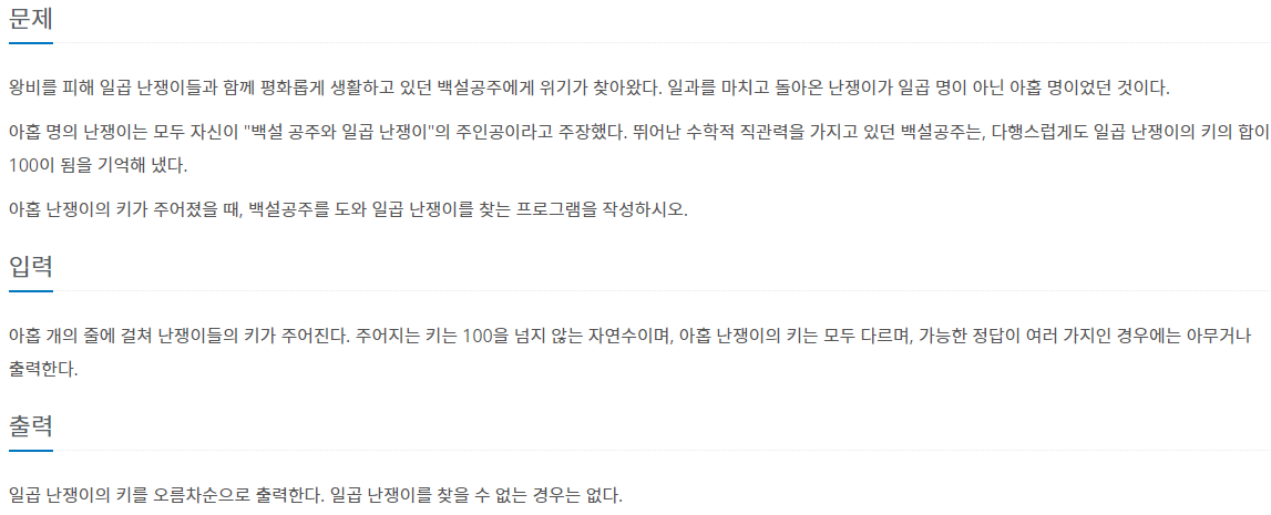 처음에 7명의 난쟁이로 100을 구하는 방법을 썻는데 3중 for문으로 나와 답이 안나왔씁니다. 고려해야할 경우도 많았구요. 다른 접근방법을 생각해보니 전체 난쟁이 중에서 2명만 거르면 되는거였습니다.