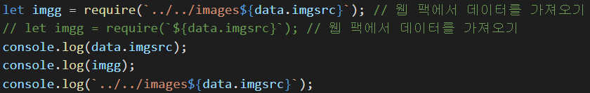 imgsrc는 json에 적혀있는데 위에서 봤던거 처럼 "/logo.png", "미끄럼틀.png" 등등이 저장되어 있습니다. 이것을 웹팩에서 꺼냅니다. 어쩌서인지는 모르겠지만 백틱 안에 webpack에서 가져옵니다.