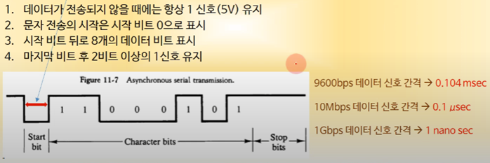 하나에 데이터를 표현하는 신호 간격이 9600 bps라면 1/9600라는 뜻이다. bps가 커지면 폭이 짧아진 다는 것이다.