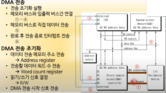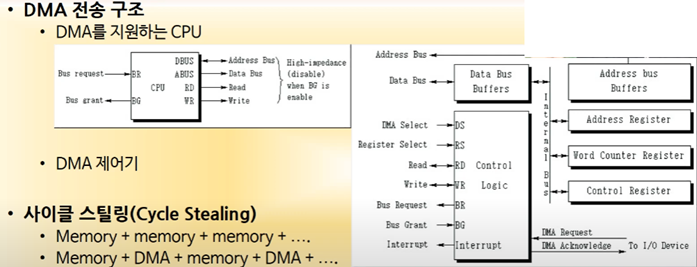 DMA - io장치가 직접 메모리에 읽고 쓰는 것이다. cpu가 관여하지 않는다.
