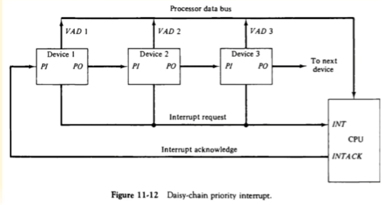 device1, device3가 둘 다 인터럽트를 보낸다. 그럼 cpu가 처리 가능상황이면 intack신호를 보낸다.