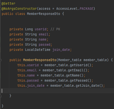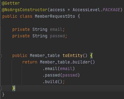 MemberResponseDto entity = memberRepository.findByEmailAndPasswd(params.getEmail(), params.getPasswd());