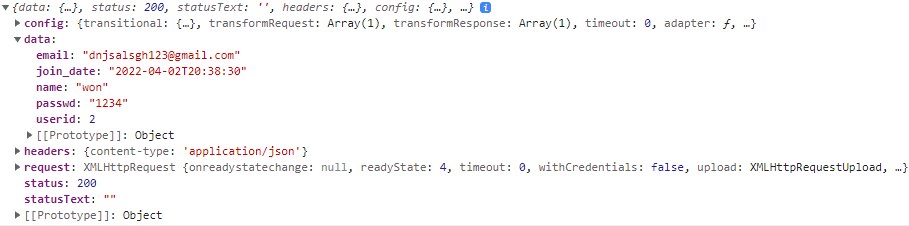 axios로 post요청을 보내는데 { email : "~~.gmail.com", passwd : "1234" } 이런식으로 data와 같이 spring에 도착하게 됩니다.