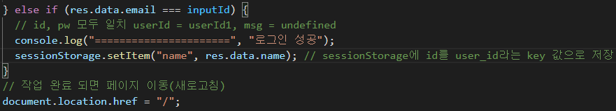 onClickLogin 마지막 부분쯤에 로그인이 성공하면 sessionStorage에 Item으로 닉네임(name)을 넣습니다. 그리고 document.location.href="/";로 메인페이지로 이동합니다.