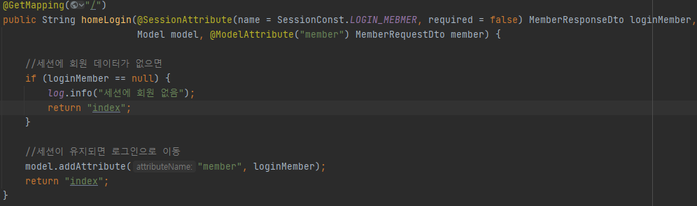 홈페이지로 이동할 때 @SessionAttribute로 session에 데이터를 저장합니다. 어떤 데이터를 저장하냐면 name으로 지정된 이름(loginmember)에 MemberResponseDto를 저장합니다.