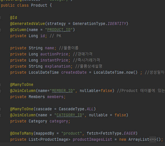 Product 테이블을 보면 @OneToMany로 product 테이블에 mappedBy되어 있습니다. 외래키를 관리 당하는 쪽입니다.