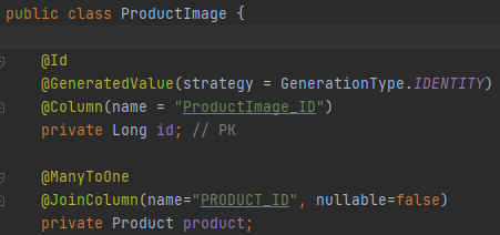 @ManyToOne으로 양방향 관계에서 외래키를 관리하고 있습니다. 외래키는 product 테이블의 Product_id 입니다.