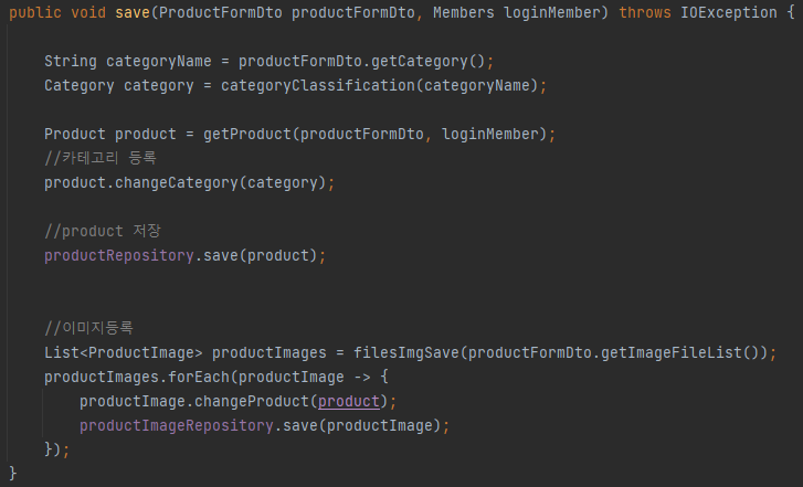 save()를 하려면 controller에서 주고 있는 productFromDto와 Mebers 객체가 필요합니다.