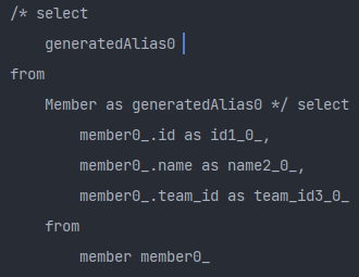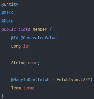 Fetch를 Lazy형태로 받아옵니다. => Member객체를 선택하면 1개의 쿼리문이 나오고 순수한 Member 요소들(id, name)만 가져오겠다는 뜻입니다.
