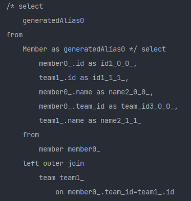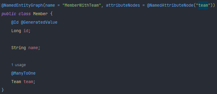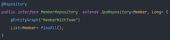 아까 만든 EntityGraph를 사용하기위해 적어주는 것입니다. 이러면 Join쿼리가 알아서 발생합니다. Member와 Team간의 Join이 발생합니다.