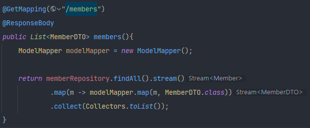 modelMapper로 List<Member> -> List<MemberDTO>로 변경했습니다.