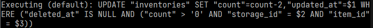 UPDATE "inventories" SET "count"=count-2,"updated_at"=$1 WHERE ("deleted_at" IS NULL AND ("count" > '0' AND "storage_id" = $2 AND "item_id" = $3))