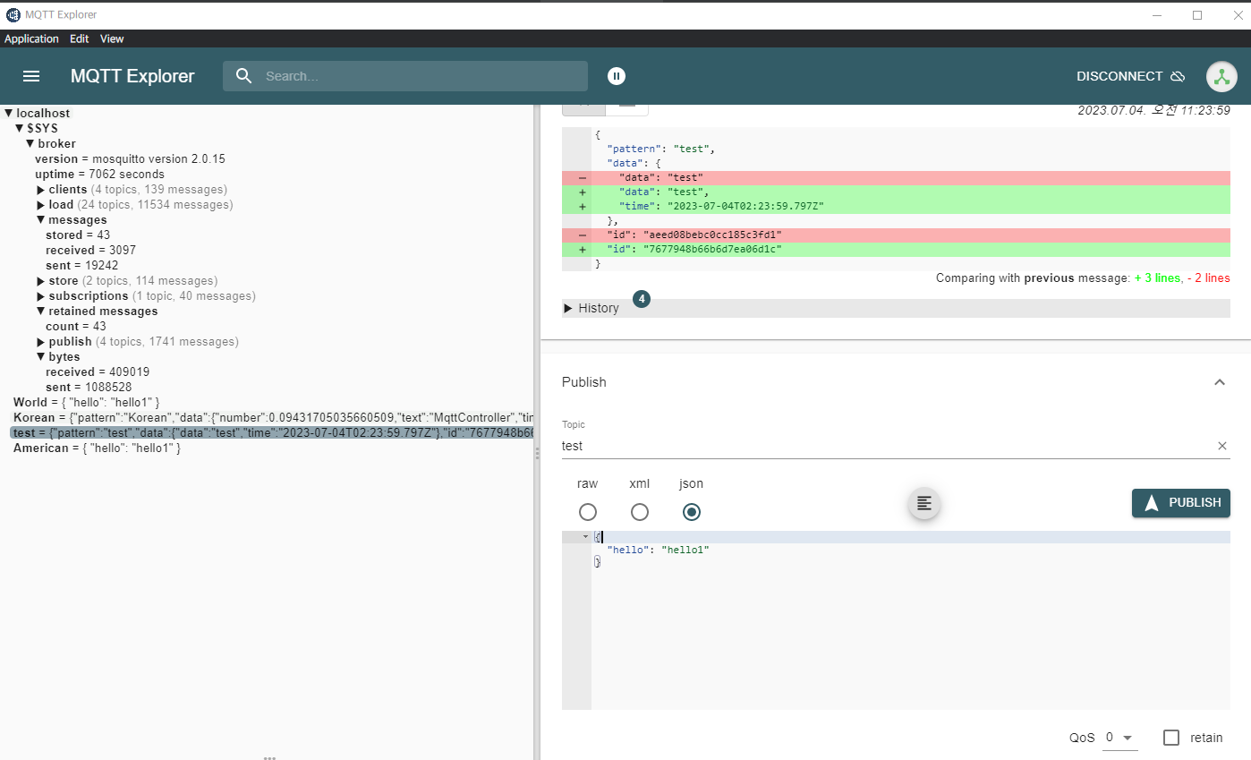 mqtt explorer로 test 토픽을 보았을 때 원하는 데이터가 들어온 것을 확인할 수 있습니다.