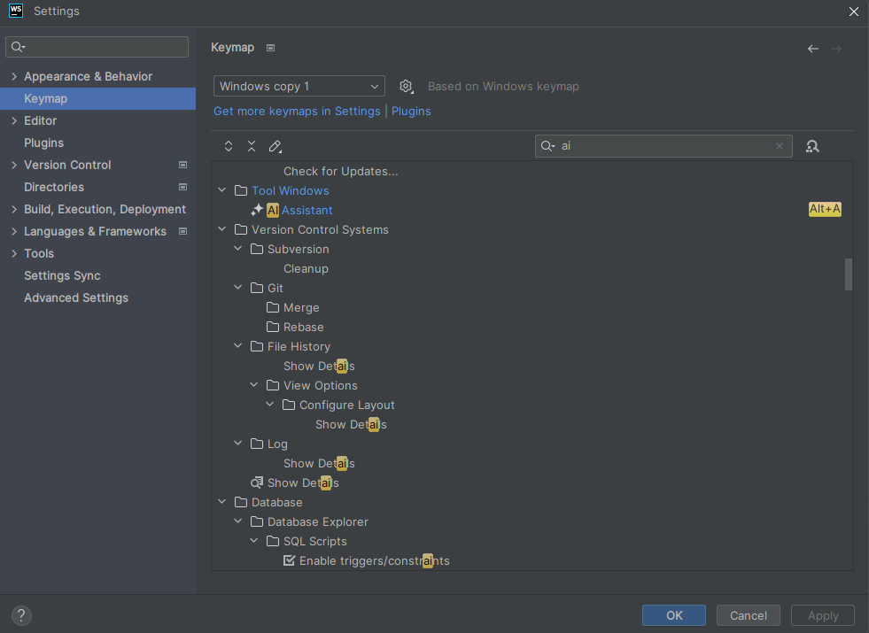 ai 채팅창의 단축키를 설정하려면 Keymap 에 가셔서 ai를 검색 한 후 Tool Windows의 Ai Assistant에 원하는 단축키를 넣으면 됩니다. (저는 Alt+A로 지정했습니다)