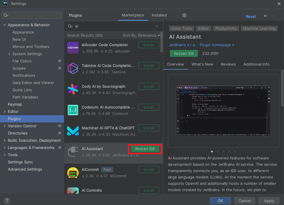 Plugins 를 클릭하고 Marketplace에 ai라고 검색합니다.