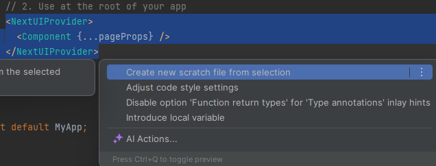어떠한 코드를 블록하고 Alt+Enter 또는 오른쪽 클릭하면 Ai Actions메세지가 뜹니다.