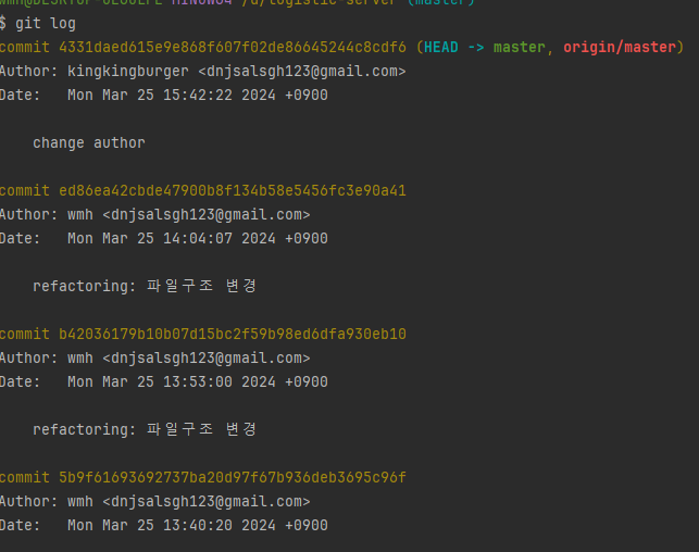 💥 이 때 주의할 점은 내가 변화시키고 싶은 git log가 있는 파일에 가서 명령어를 실행시켜야 합니다. 보통 프로젝트 파일의 최상단의 .git 파일의 log를 변화시킨다고 생각하면 됩니다.